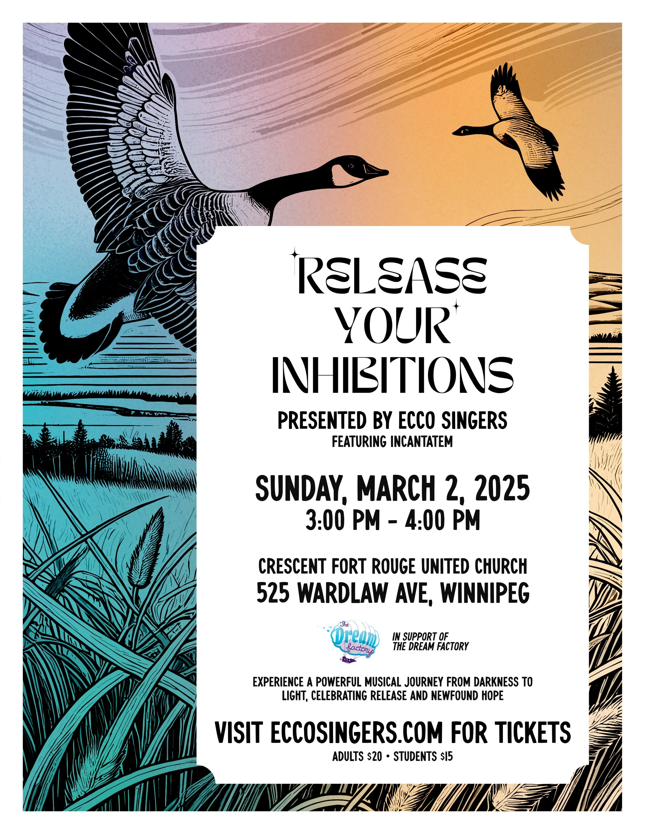Echoing back to the dark and light, come along as we sing songs of the journey from dark to light, and the release and new found hope that follows. Release Your Inhibitions is Ecco’s second concert of the season and will be held on Sunday, March 2 at 3:00 pm at Crescent Fort Rouge United Church. We will be joined by Incantatem, another local community choir.