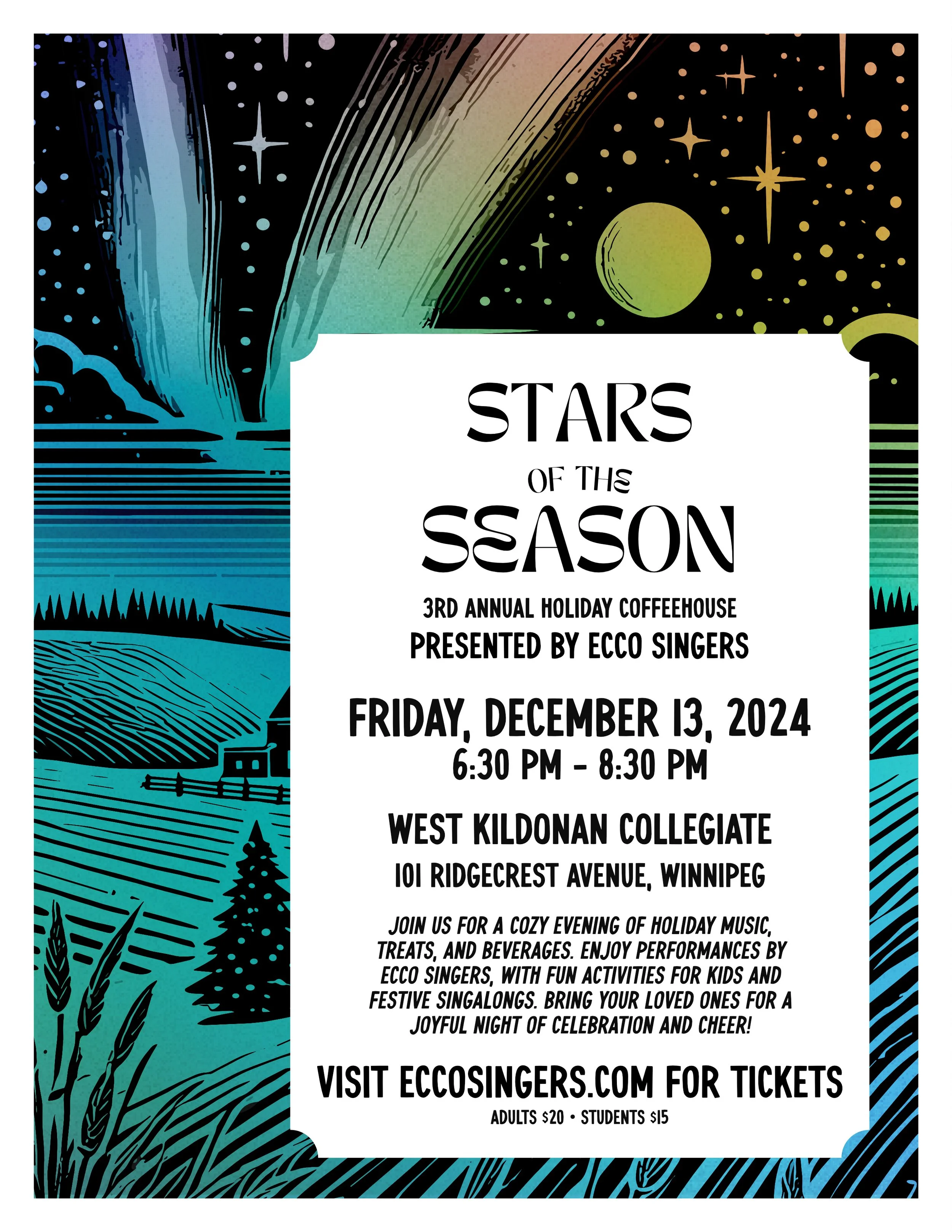 There will be some table activities for kids and a couple of good old singalongs too! Join us on Friday, December 13th, 2024 at West Kildonan Collegiate (101 Ridgecrest Ave) at 7:00 pm for an enchanting evening full of music of the holidays, laughter, and the company of loved ones.