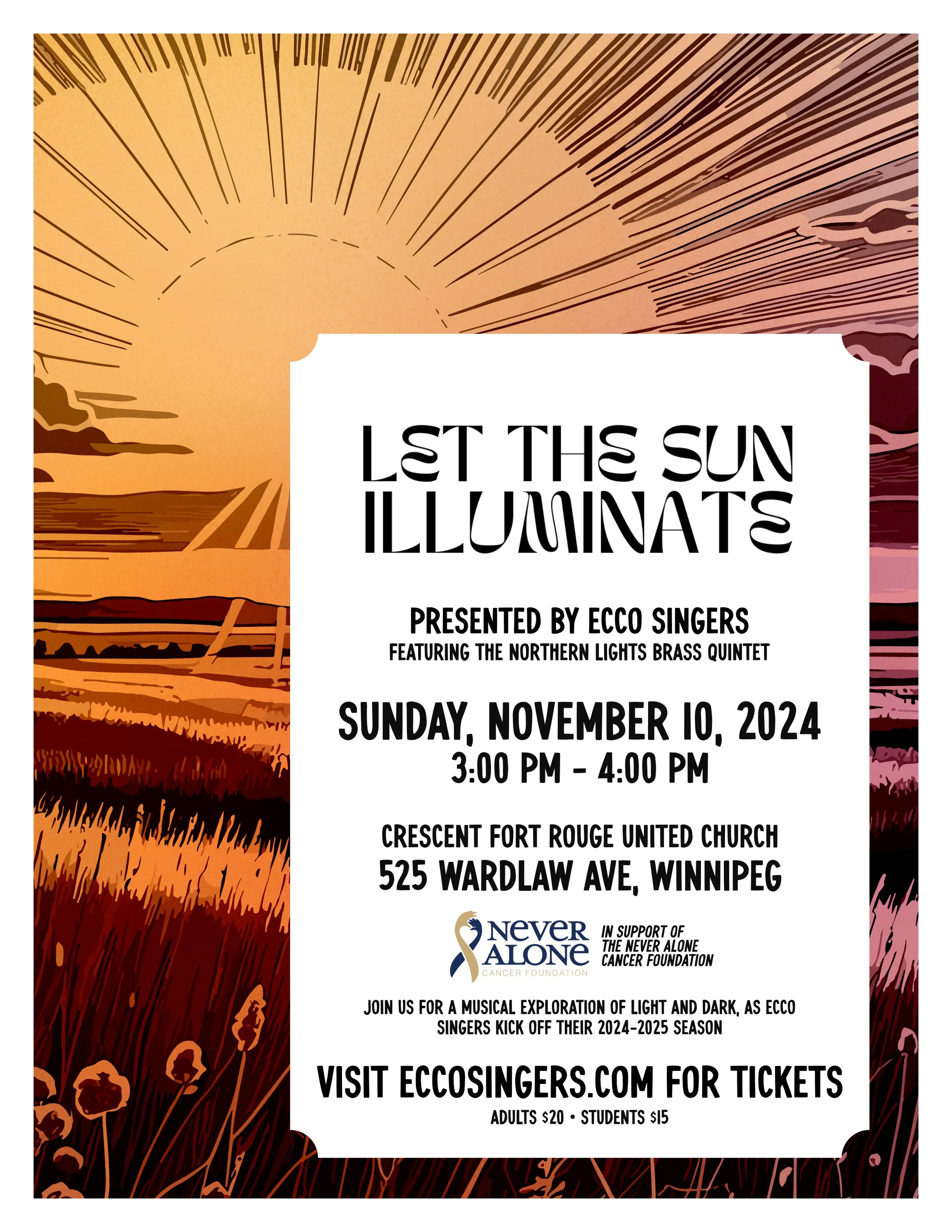 The concepts of darkness and light are ever present in our world in nature, emotions, and, consequently, in music. Join us as Ecco starts the 2024-2025 season with a musical exploration of light, dark, and the movement from one to the other. Let the Sun Illuminate will be held on Sunday, November 10 at Crescent Fort Rouge United Church at 3:00 pm.