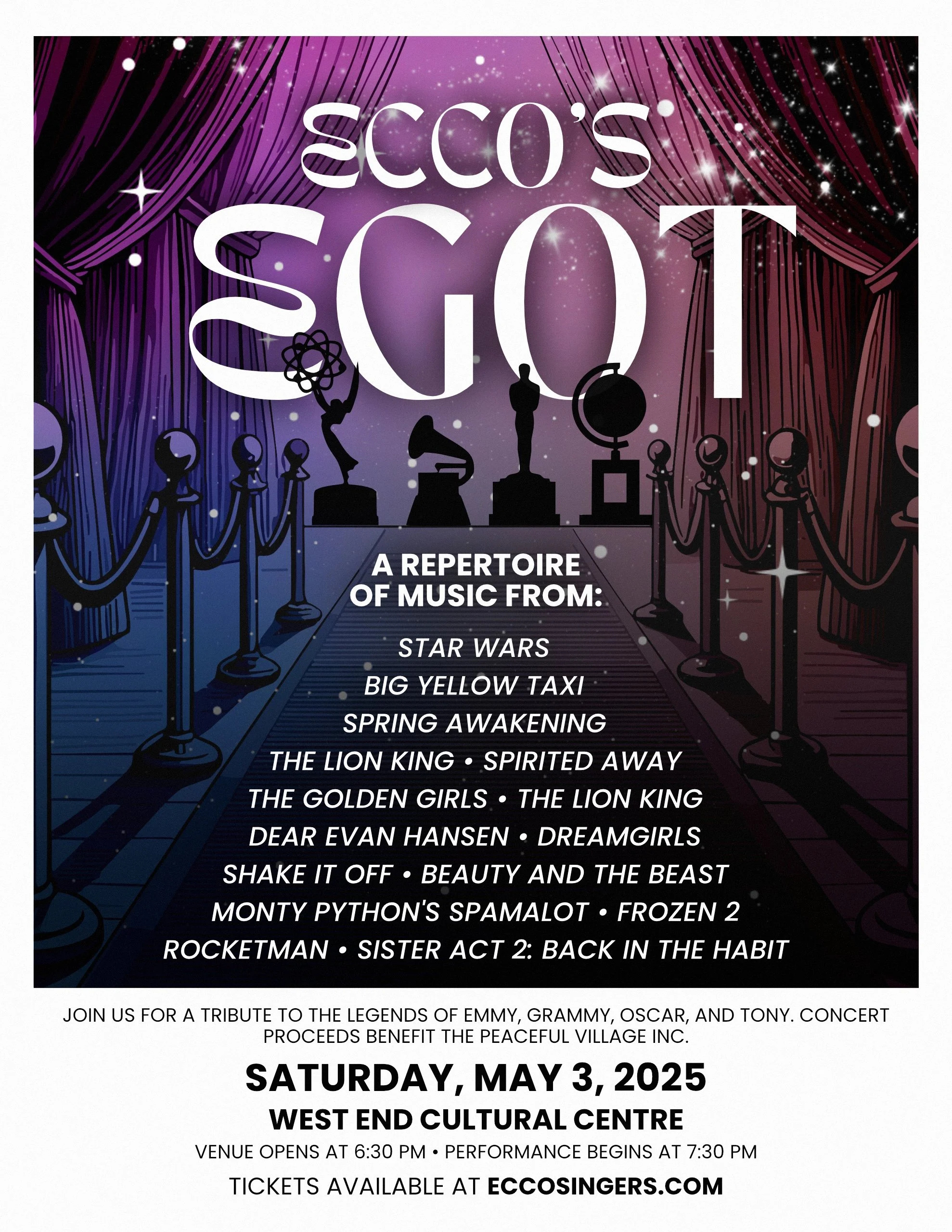 The rare and coveted EGOT status (winner of an Emmy, Grammy, Oscar, and Tony) represents the ultimate achievement in television, music, film, and theatre. In this dazzling concert at the West End Cultural Centre, Ecco pays tribute to the legends who have conquered all four realms. Whether you're a movie buff, a theatre lover, or a streaming enthusiast, this show promises to captivate and inspire.